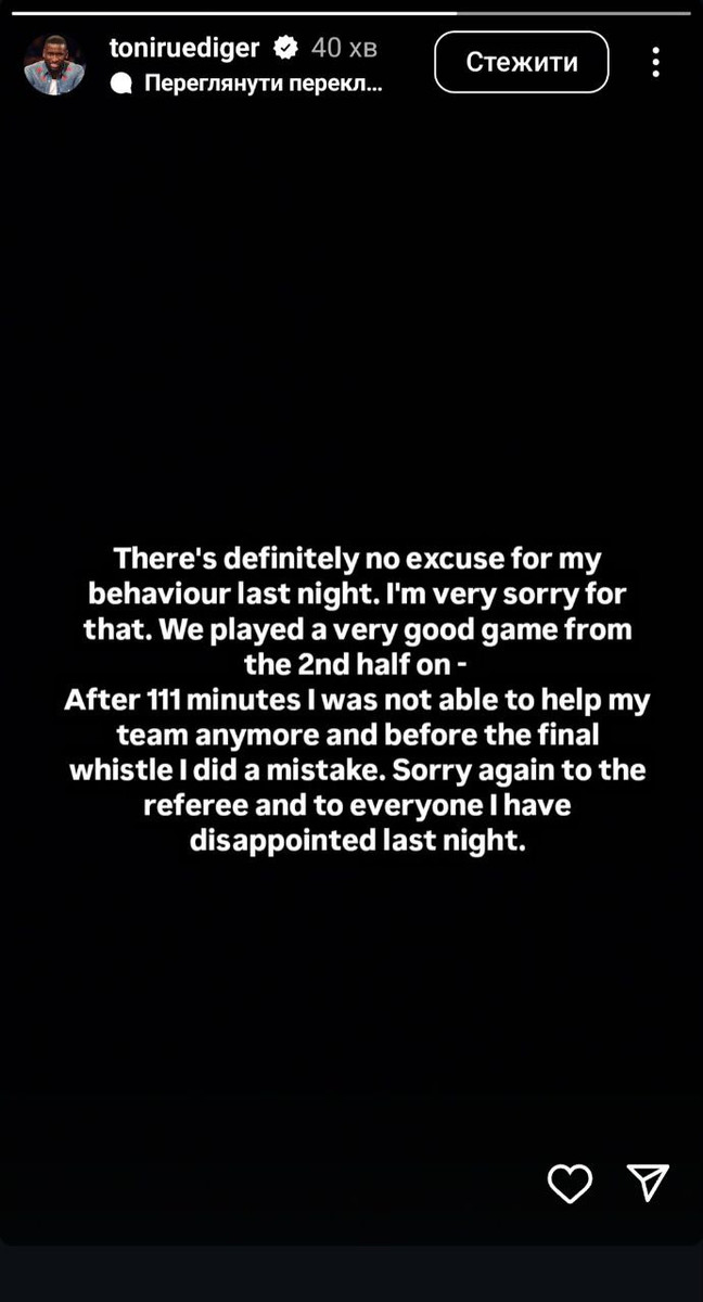 Должен извиниться перед арбитром и всеми, кого я разочаровал", – написал Рюдигер.