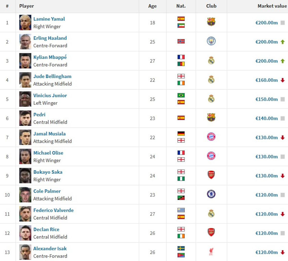 В первую пятерку рейтинга вошли еще двое представителей мадридского Реала: полузащитник Джуд Беллингем (160 млн евро) и вингер Винисиус Жуниор (150 млн евро). Интересно, что действующий обладатель Золотого мяча Усман Дембеле из ПСЖ с ценником 100 млн евро занимает 19-то место.