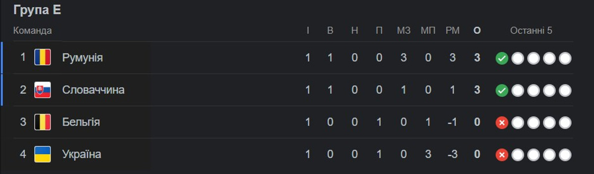 Из-за разницы глав украинская национальная команда расположилась на последнем месте, Румыния возглавляет турнирную таблицу, Словакия вторая, а Бельгия третье.