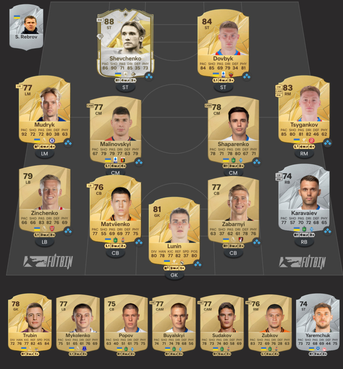 Резерв: Анатолий Трубин (78), Виталий Миколенко (77), Денис Попов (75), Виталий Буяльский (77), Георгий Судаков (77), Александр Зубков (76), Роман Яремчук (74)