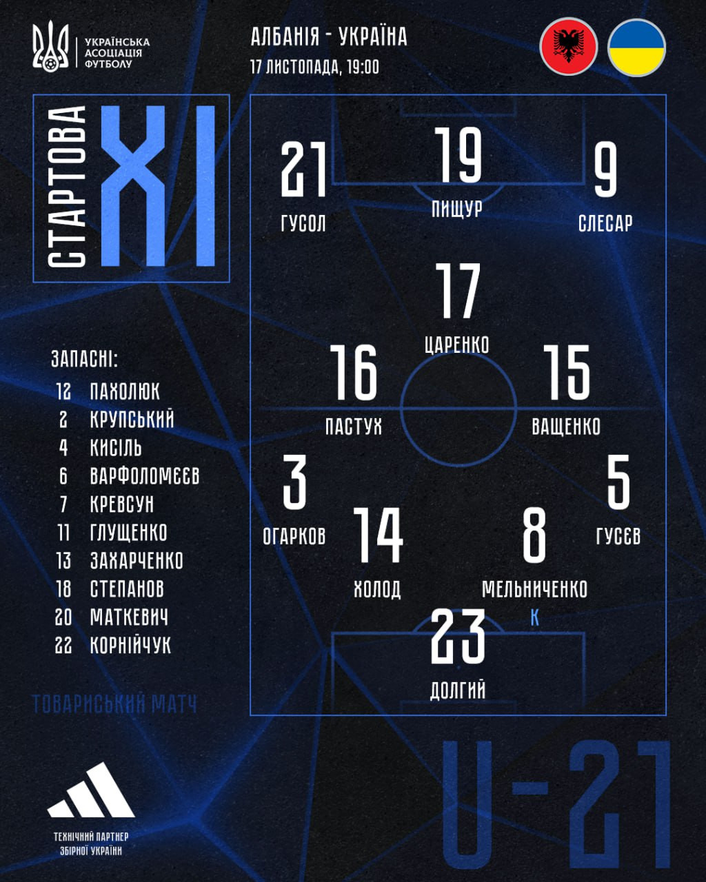Сборная Украины U-21: Долгий, Огарков, Холод, Мельниченко, Гусев, Пастух, Ващенко, Царенко, Гусол, Пищур, Слесар