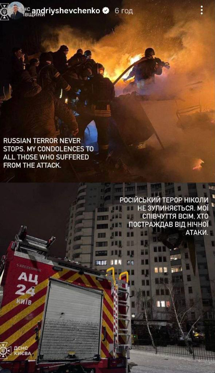 "Российский террор никогда не останавливается. Мои соболезнования всем, кто пострадал от ночной атаки", – написал Шевченко.
