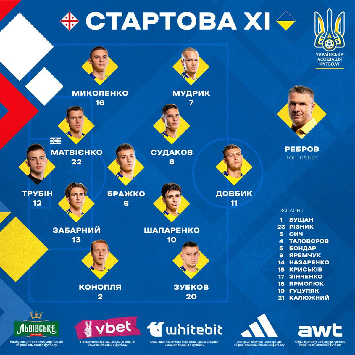 Главный тренер сборной Украины Сергей Ребров назвал стартовый состав на матч 5 тура Лиги наций против Грузии.
