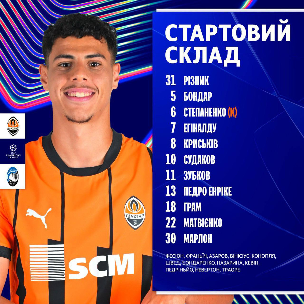 Тренерский штаб донецкого Шахтера объявил стартовый состав на матч Лиги чемпионов против итальянской Аталанты.
