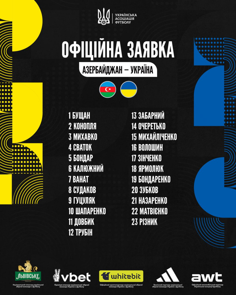 Заявка Украины на матч против Азербайджана в отборе на ЧМ-2026
