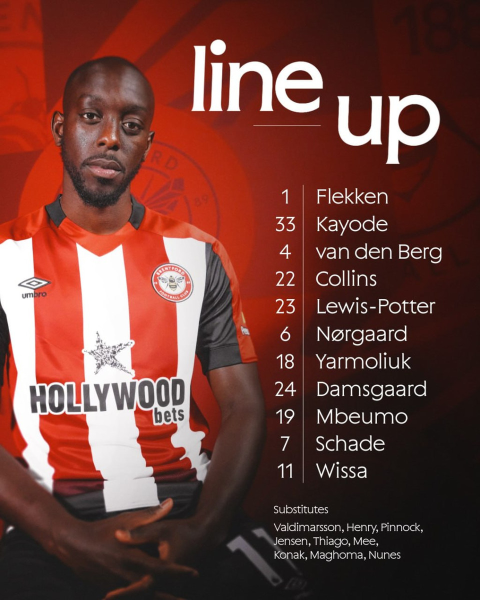 Состав Брентфорда: Флеккен, Кайоде, Ван дер Берг, Льюис-Поттер, Норгор, Ярмолюк, Дамсгор, Мбеумо, Шаде, Висса