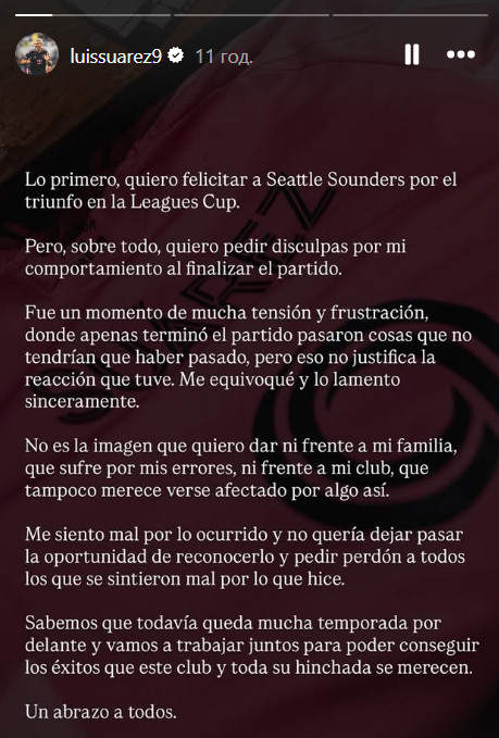 Это не тот образ, который я хочу создавать перед своей семьей, которая страдает из-за моих ошибок, и Интер Майами также не заслуживает того, чтобы это на него повлияло. Мне жаль того, что произошло, и я не хотел упустить эту возможность признать это и попросить прощения у всех, кто чувствовал себя плохо из-за того, что я сделал.