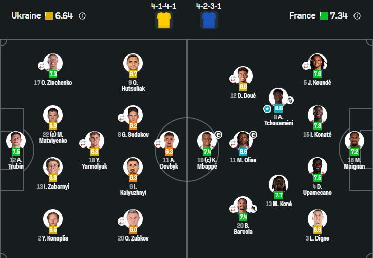 Оценки выставил статистический портал Sofascore, Трубин получил 7,5 баллов. после него 7,3 получил Александр Зинченко. Лучшим игроком матча был признан Орельен Чуамени, который получил 8,8 баллов.