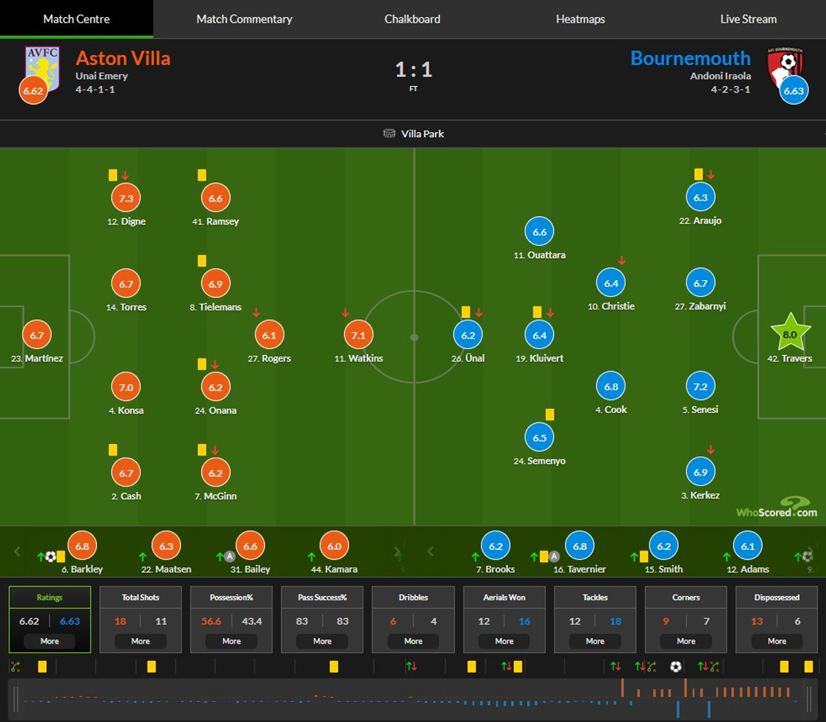 Украинский защитник Борнмута Илья Забарный получил среднюю оценку за матч 9 тура Английской Премьер-лиги против Астон Виллы (1:1).
