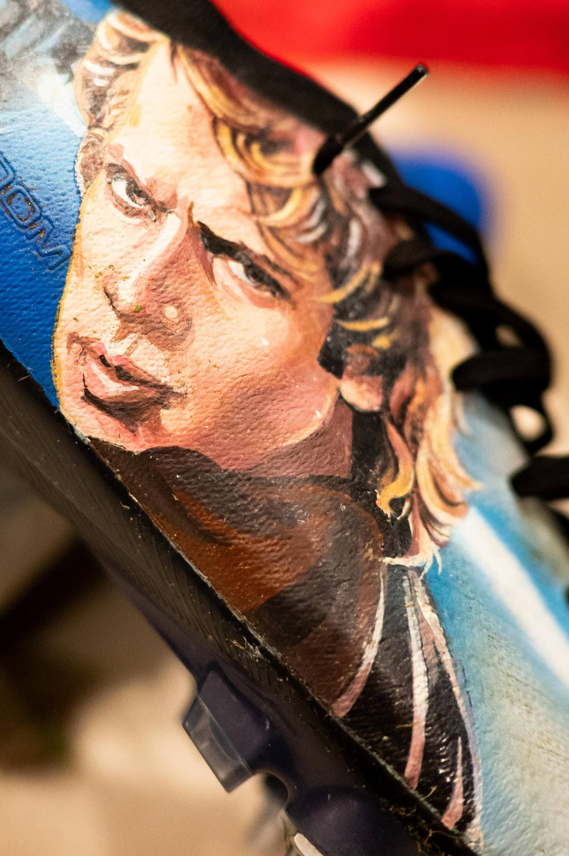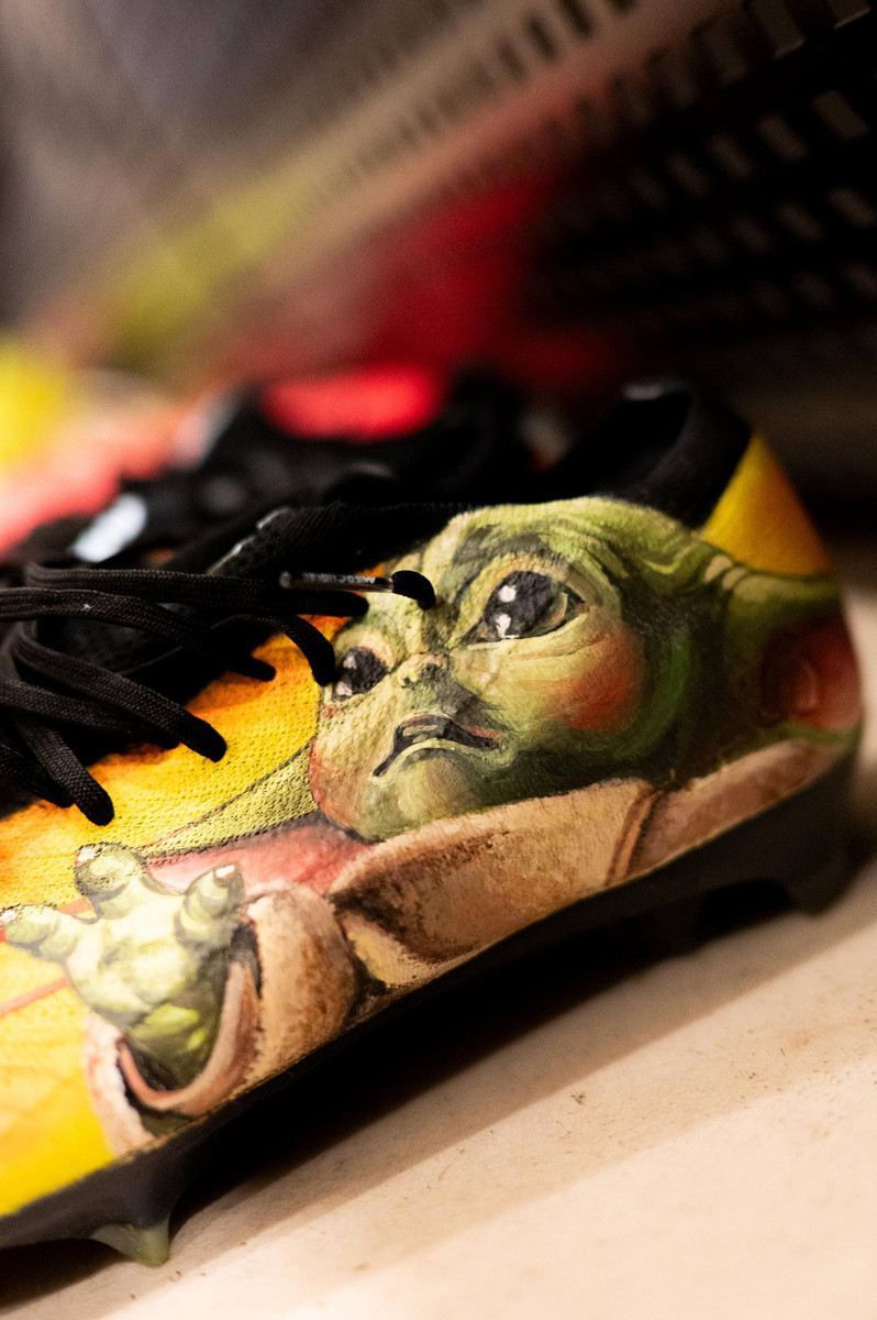 На одной бутсе изображен знаменитый Мастер Йода, символ мудрости и силы, а на другой – Энакин Скайуокер, один из самых ярких и опасных персонажей вселенной Джорджа Лукаса.