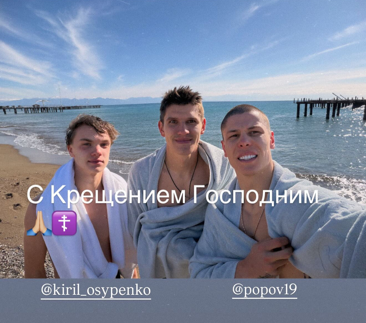 Защитник Кристиан Биловар опубликовал в соцсетях совместное фото с-за границы, на котором он вместе с Денисом Поповым и Кириллом Осипенко купается в море по случаю праздника.