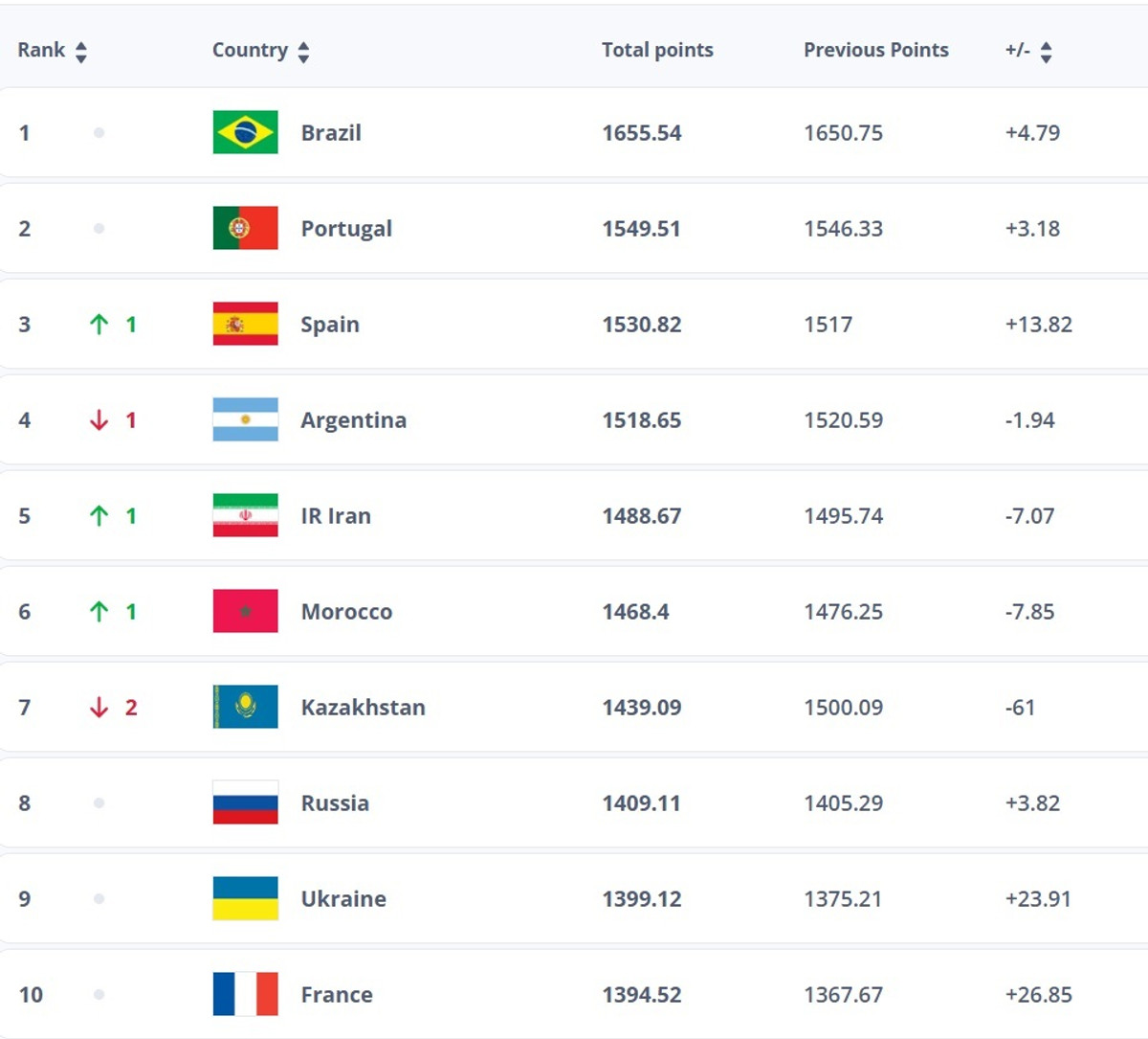 Бразилия и Португалия сохранили за собой первые две строчки, на третье место поднялась Испания, которая обошла Аргентину. Казахстан потерял две позиции, опустившись на седьмое место и пропустив Иран и Марокко.