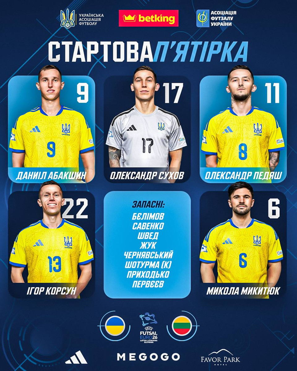 Сборная Украины по футзалу назвала стартовый состав на матч 2 тура группового этапа чемпионата Европы-2026 против Литвы.