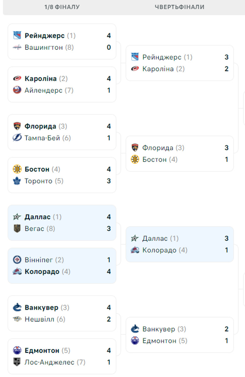 Каролина разгромила Рейнджерс (4:1; 2:3 в серии), а Даллас уничтожил своих географических соседей Колорадо (5:1; 3:1 в противостоянии).
