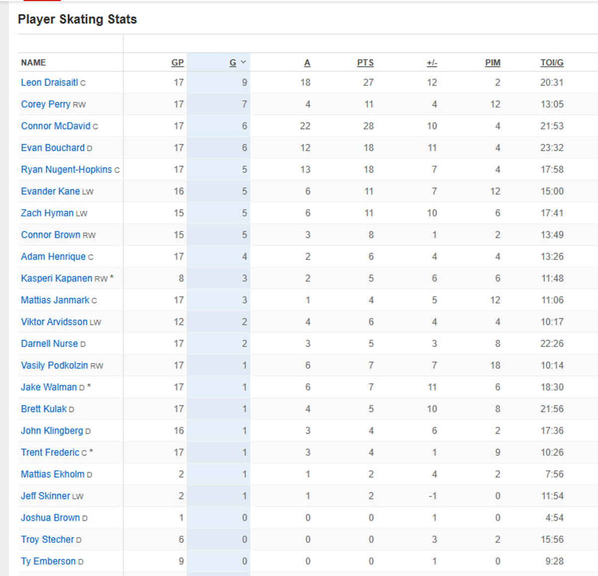 Лидером команды по заброшенным шайбам является Леон Драйзайтль, который 9 раз переправлял шайбу в ворота соперников. Немецкий нападающий благодаря успешной игре против Пантерз обновил несколько достижений плей-офф НХЛ.