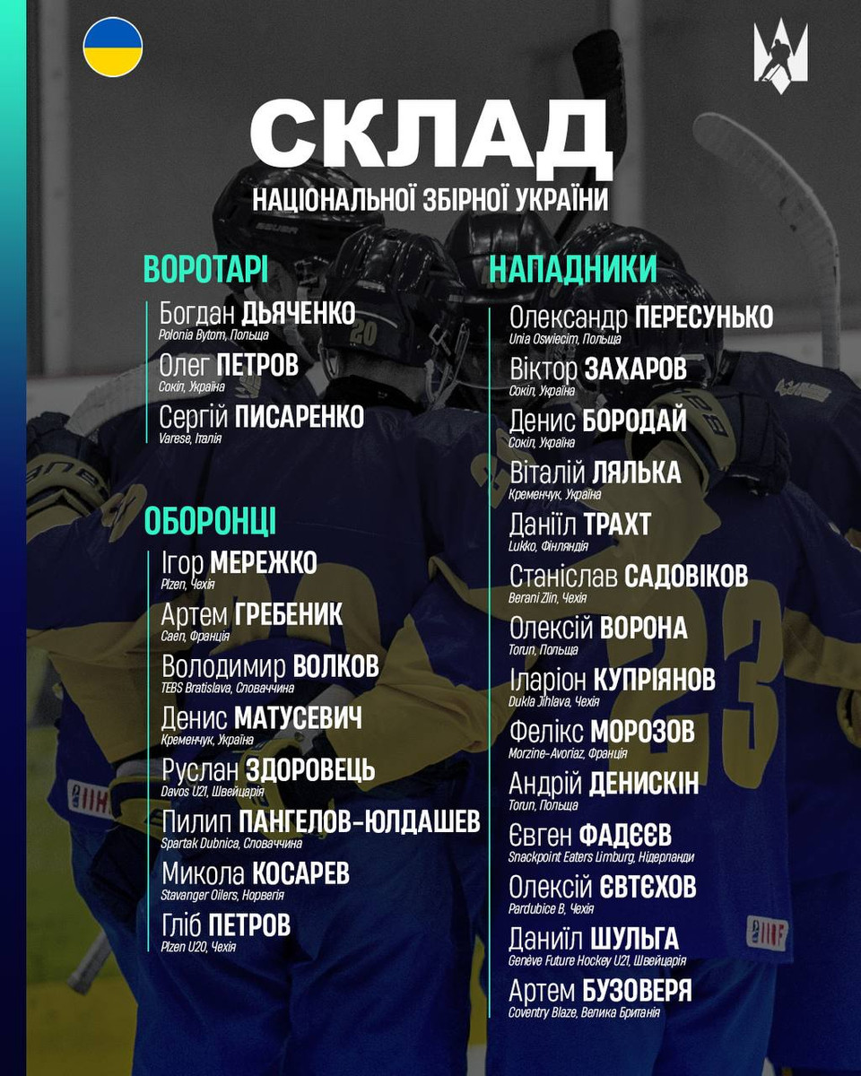 - Нападающие: Александр Пересунько (Unia, Польша), Виктор Захаров (Сокол, Украина), Денис Бородай (Сокол, Украина), Виталий Лялька (Кременчуг, Украина), Даниил Трахт (Lukko, Финляндия), Станислав Садовиков (Berani Zlin, Чехия). Алексей Ворона (Torun, Польша), Илларион Куприянов (Dukla Jihlava, Чехия), Феликс Морозов (Morzine-Avoriaz, Франция), Евгений Фадеев (Snackpoint Eaters Limburg, Нидерланды), Андрей Денискин (Torun, Польша), Алексей Евтехов (Pardubice B, Чехия), Даниил Шульга (Genève Future Hockey U-21, Швейцария), Артем Бузоверя (Coventry Blaze, Великобритания)