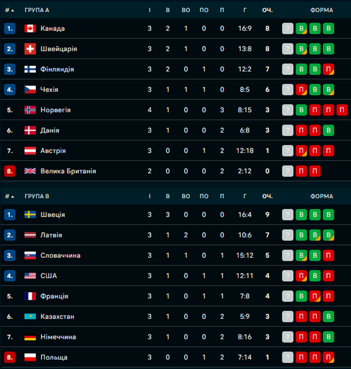 Также Польша потерпела поражение от Франции в матче аутсайдеров Группы B.По итогам трех раундов группового этапа лишь Швеция одержала три победы в основное время. Ни одного зачетного пункта не заработали два представителя группы A - Австрия и Великобритания.