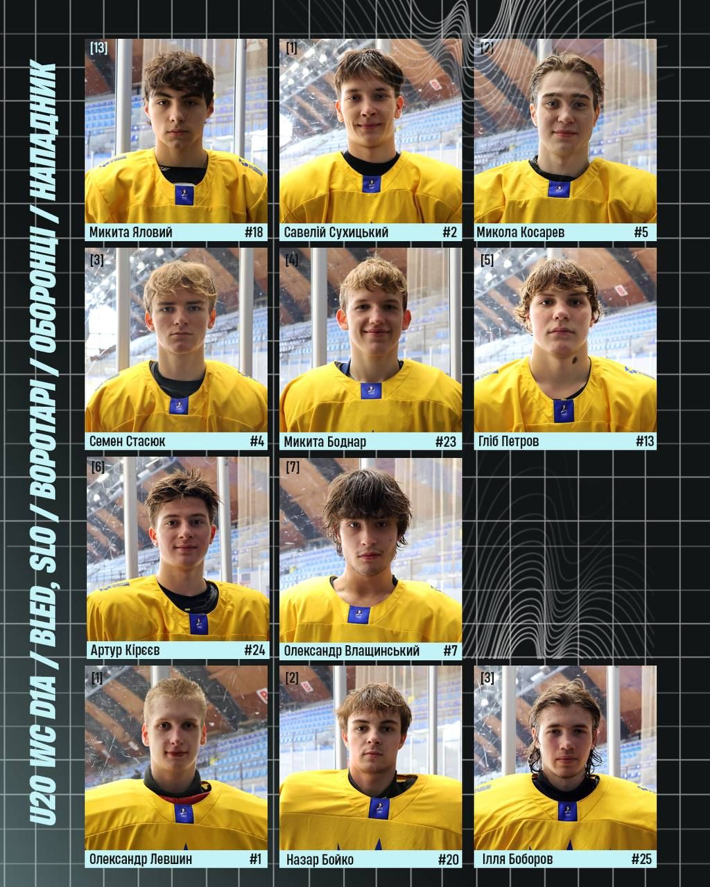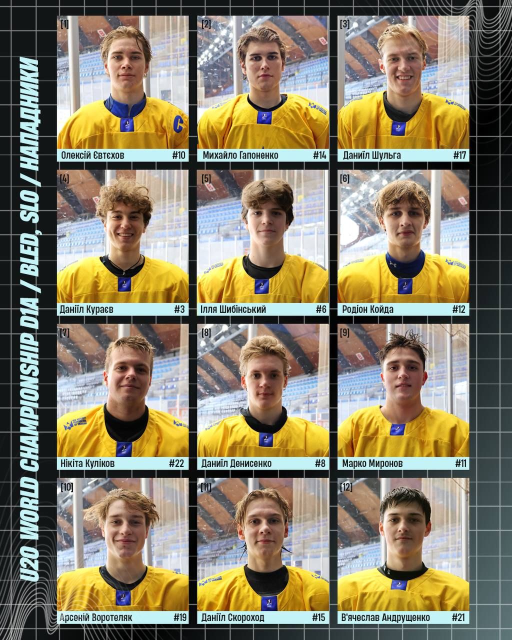 Форварды: Алексей Евтехов (Dynamo Pardubice В, Чехия), Никита Яловой (Slavia Praha U20, Чехия), Марко Миронов (Chilliwack Jets, Канада), Даниил Шульга (Genève Future Hockey U21, Швейцария), Никита Куликов (La Ronge Ice Wolves, Канада), Даниил Денисенко (Chilliwack Jets, Канада), Михаил Гапоненко (Guelph Storm, Канада), Илья Шибинский (Guelph Storm, Канада), Даниил Кураев (Stavanger Oilers U20, Норвегия), Андрей Выставкин (Mountfield HK U20, Чехия), Родион Койда (Poruba U20, Чехия), Арсений Воротеляк (Jungadler Mannheim U20, Германия), Вячеслав Андрущенко (Кременчуг, Украина), Даниил Скороход (Сокол, Украина).