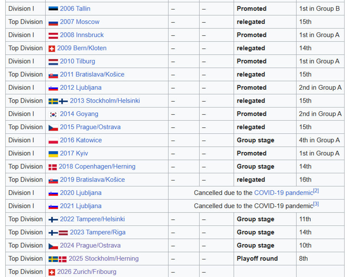 В 2019 году французы таки вылетели. Впрочем, из-за COVID-19 чемпионат мира не состоялся в 2020 и 2021 годах, а потом россияне поверили в "Киев за три дня" и были "временно изгнаны" вместе с белорусами из элиты.