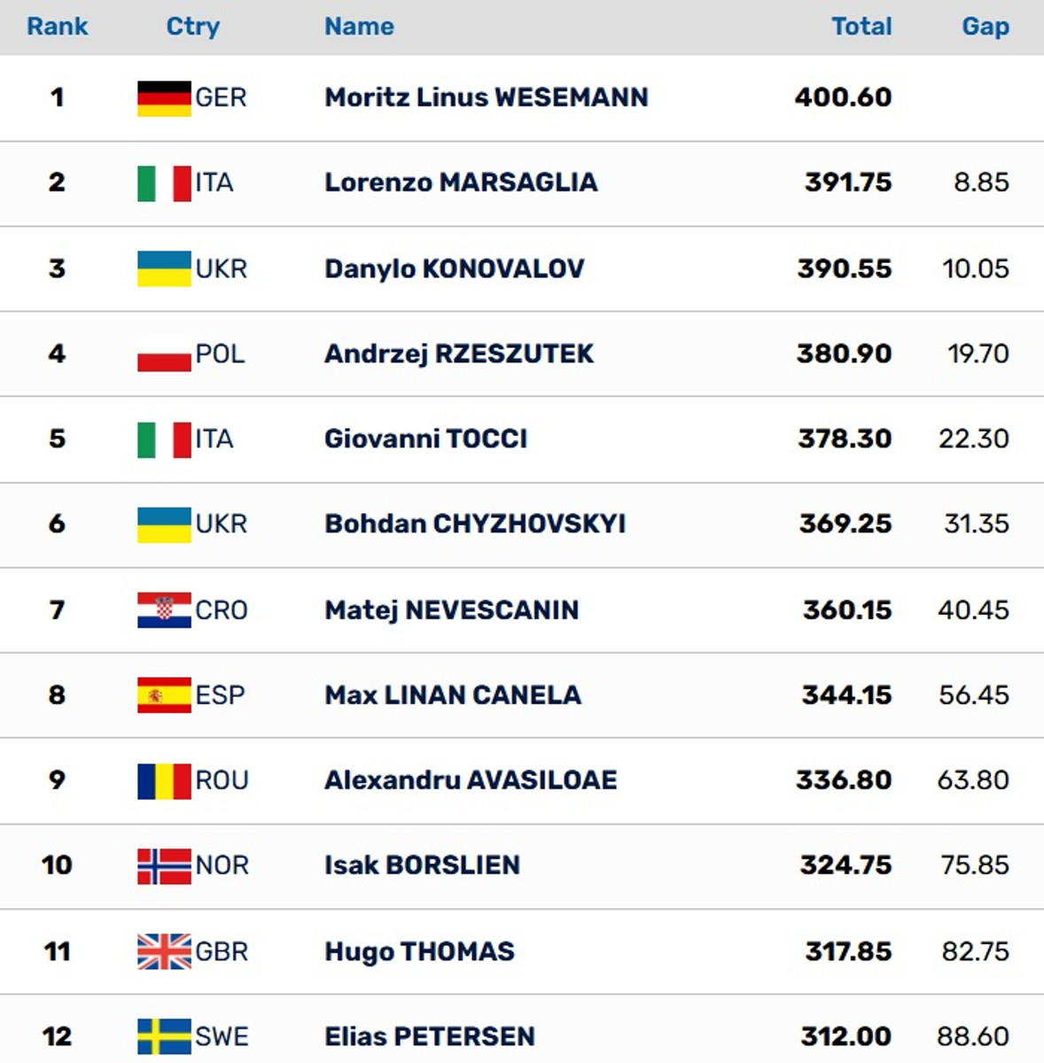 Коновалов набрал 390,55 балла, проиграв лишь немцу Маритцу Линусу Веземанну и представителю Италии Лоренцо Марсальи. Еще один украинец, Богдан Чижовский, показал шестой результат.