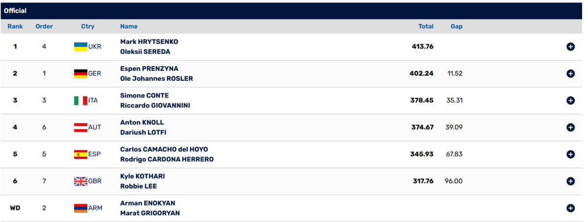 Почти на 12 баллов меньше набрали немцы Эспен Пренжина и Оле Йоханнес Рьослер. Бронзовые медали достались итальянцам Симон Конте и Рикардо Джованнини.