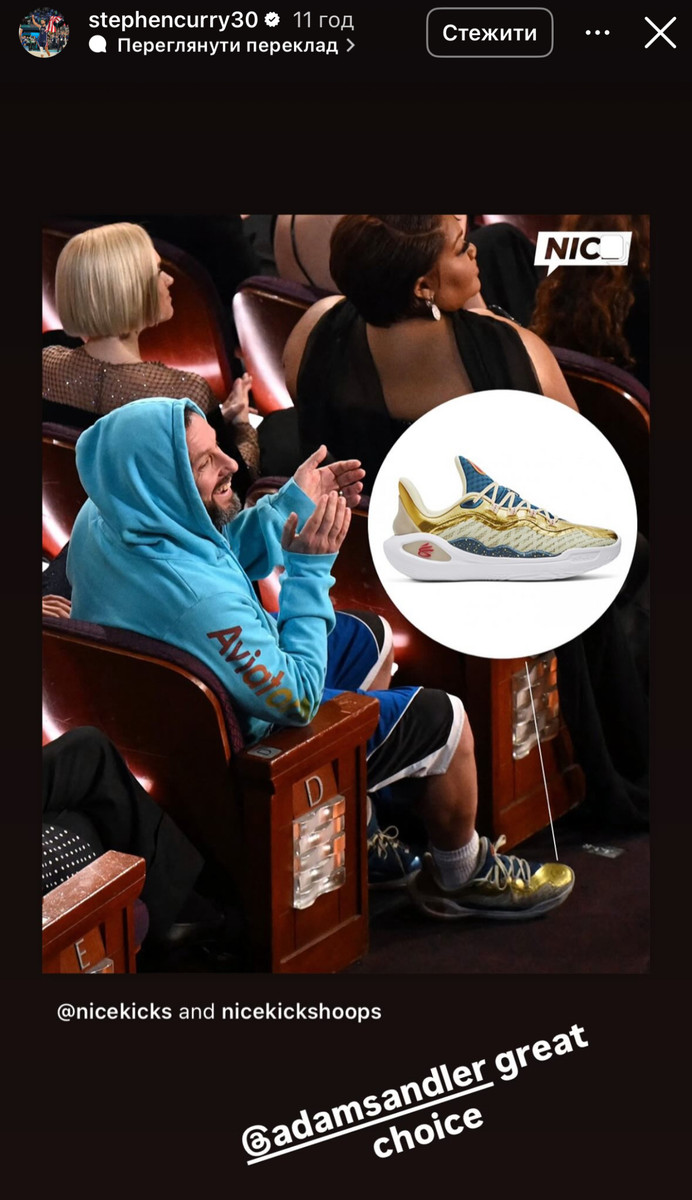 Но еще до этого зрители заметили интересный нюанс в его образе – на ногах у Сэндлера были фирменные кроссовки Стефена Карри, в частности модель Curry 11 "Championship Mindset".