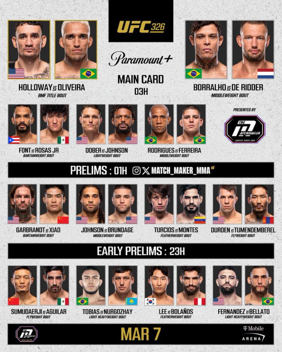 Турнир UFC 326 пройдет в воскресенье ночью, 8 марта. Стартует ивент в 01:00 по Киеву с ранних прелимов. В 03:00 начнутся бои предварительного карда, в 05:00 состоятся главные поединки. Приблизительный старт мейн-ивента Холлоуэй vs Оливейра - 07:00.