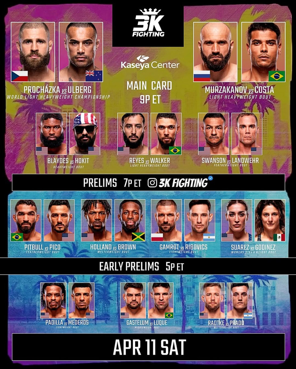 В главном поединке вечера на кону будет стоять вакантный титул в полутяжелом весе: харизматичный чех и любитель тренироваться среди гор и лесов, Иржи Прохазка, попытается вернуть себе чемпионский статус в противостоянии с опасным нокаутером Карлосом Ульбергом.