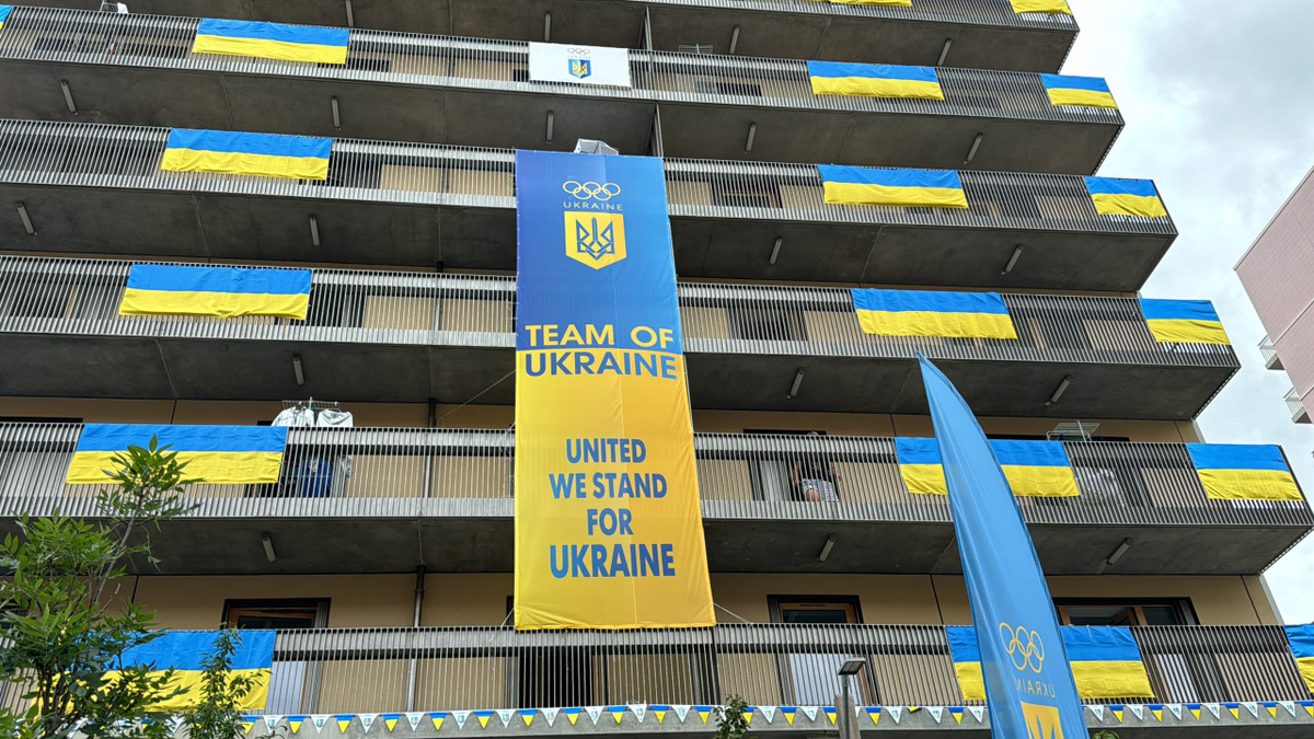 Все десятиуровневое сооружение отдано нашей олимпийской команде. Четыре флага с фасада на каждом из десяти этажей обрамляют два больших длинных баннера сине-желтого цвета с надписью «We stand for Ukraine». В самом центре фронтальной стороны – флаг НОК Украины.