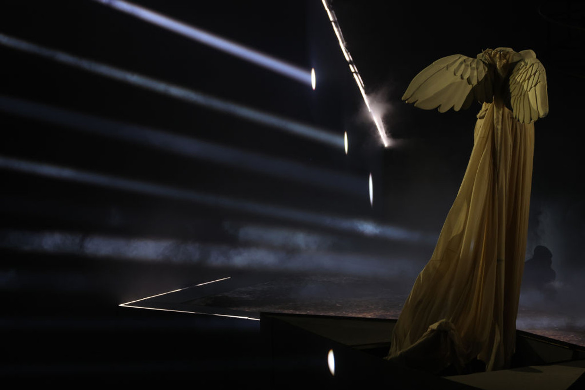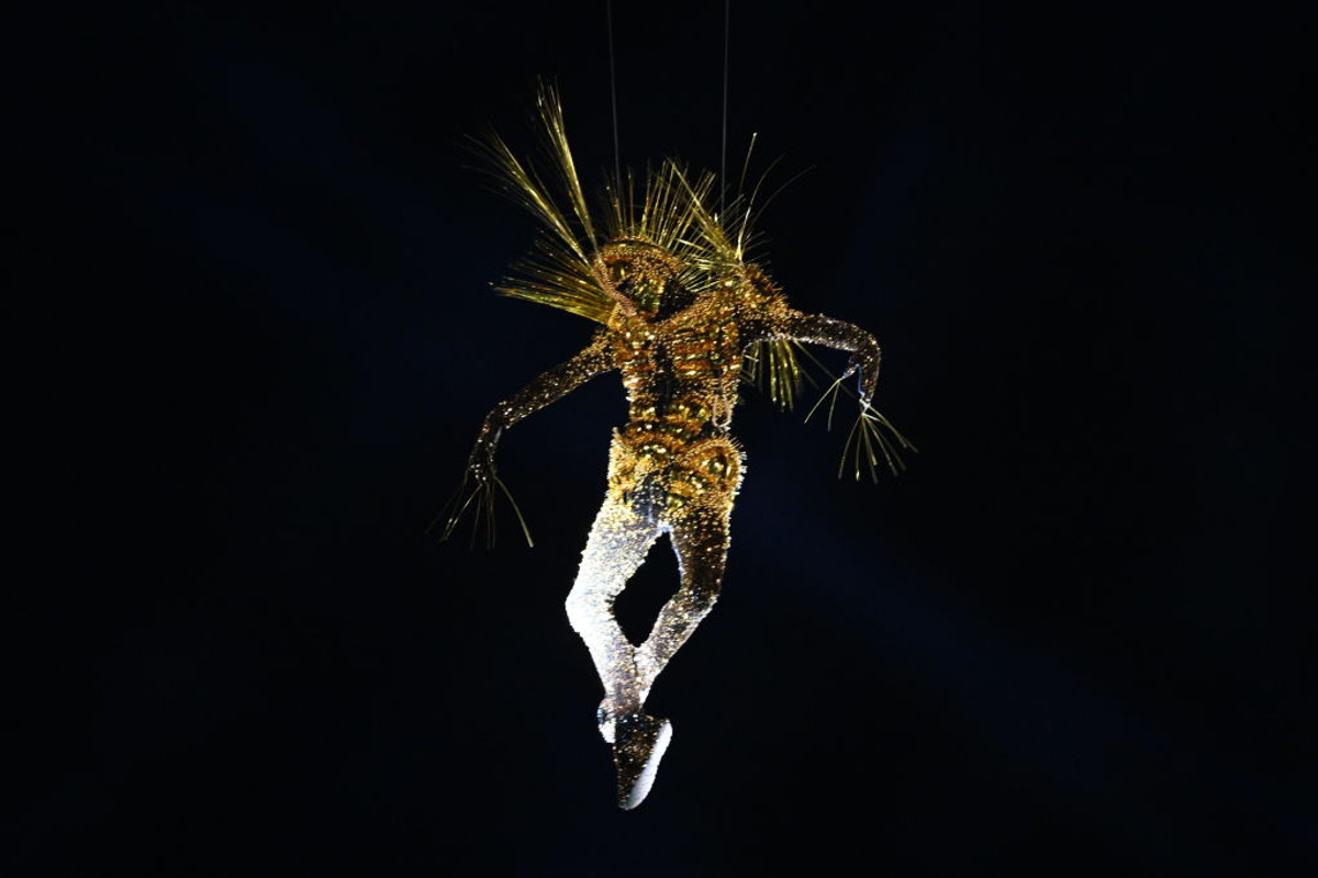 Снова игра света и музыки – весь стадион замерцал и из недр сцены появилась безголовая античная статуя с крыльями – ох уж эти французы со своими аллегориями! А потом с неба спустились странные белые акробаты, которых было очень много — как нашествие инопланетян: фантастическая тема продолжилась. Одним словом, все эти персонажи танцевали, вылезали на конструкцию, вроде бы что-то искали. Сначала это выглядело немного непонятным и можно было даже зевнуть.