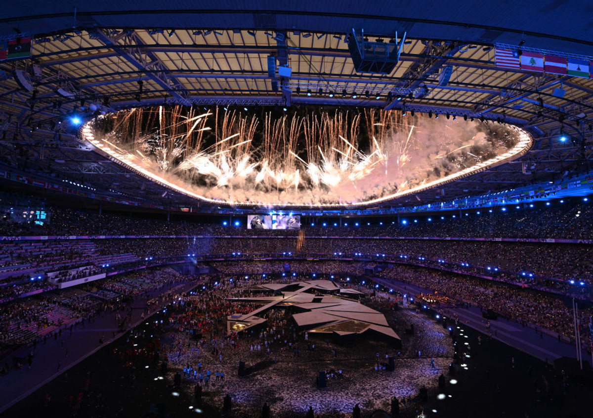 И вот тут появился Леон Маршан с огоньком, чье появление публика встретила громким скандированием "Леон-Леон"! Тогда Маршан встал с шестью олимпийскими медалистами, которые уже раньше поднимались на сцену, и потушили огонь! После этого французская певица Изольт спела Синатровый My Way, в завершение которого над "Стад де Франсом" прогремел фейерверк. Недолгий, но яркий.