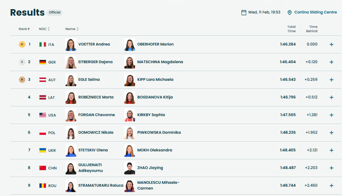 В среду, 11 февраля, на Олимпийских играх-2026 был разыгран первый в истории комплект медалей в санном спорте в дисциплине женских двоек.