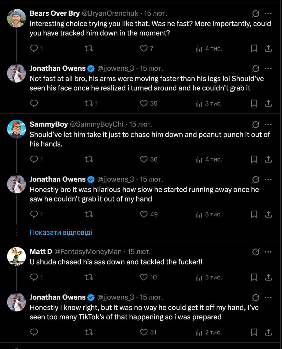 Футболист, выступающий за Чикаго Беарз, рассказал в соцсети X, что неизвестный пытался вырвать из его рук пакет с покупками прямо посреди улицы.