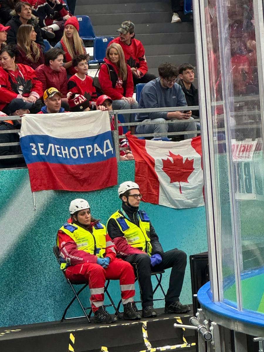 Российский флаг с надписью "Зеленоград" заметили на четвертьфинале Олимпиады-2026 между Канадой и Чехией