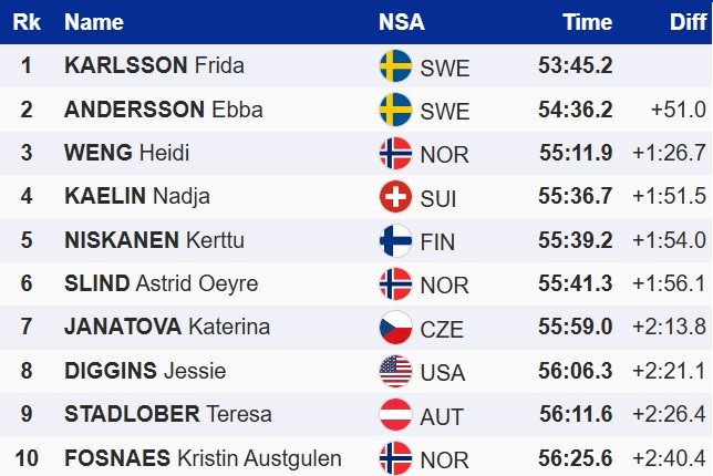 В борьбе за бронзу лучшей стала легендарная ветеранка сборной Норвегии, Хейди Венг. Она проиграла Карлссон 1 минуту и 26 секунд.