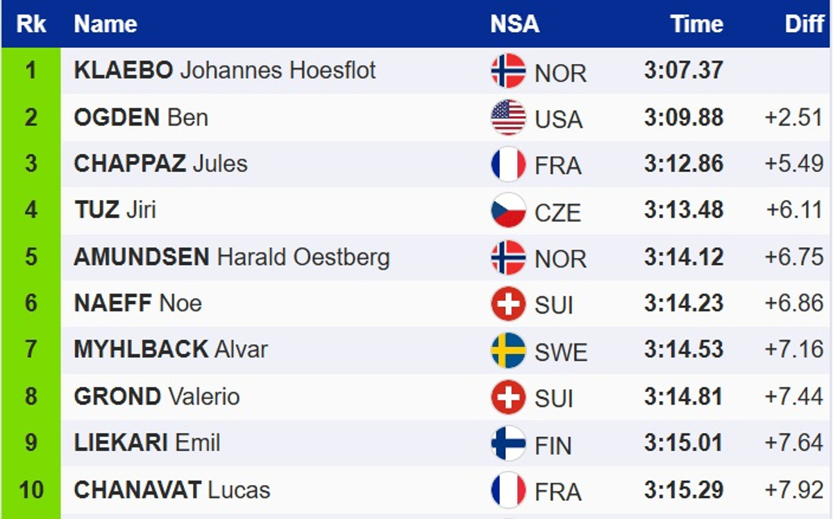 Победу в квалификации одержал норвежец Йоханнес Клэбо. Он опередил американца Бена Огдена и француза Жюля Шаппаза.