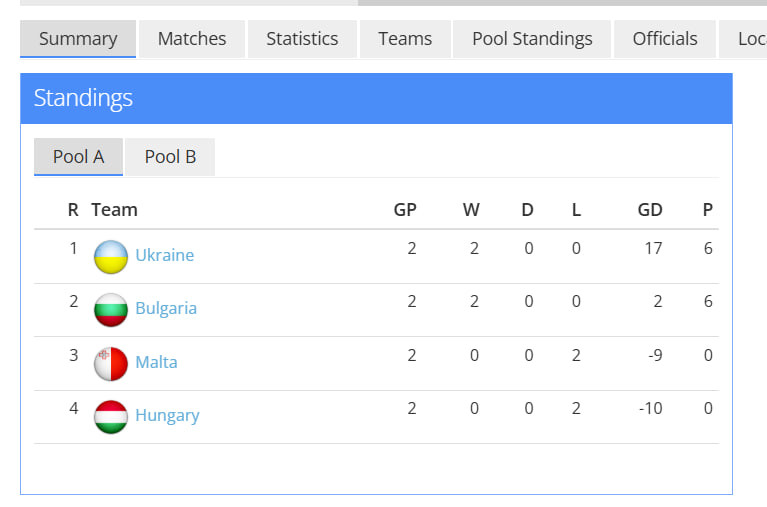 После двух туров сборная Украины делит лидерство с Болгарией, но опережает эту команду благодаря значительно лучшей разнице голов. Сборные Украины и Болгарии завтра определят победителя группы.