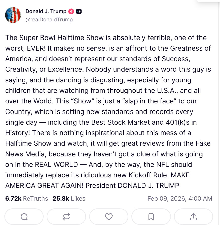 Президент Соединенных Штатов Америки Дональд Трамп остался недоволен выступлением певца Bad Bunny во время Half-Time Show на Супербоуле 2026.