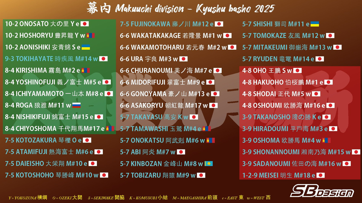 Турнирная таблица турнира Kyushu 2025 после 12 дней соревнований