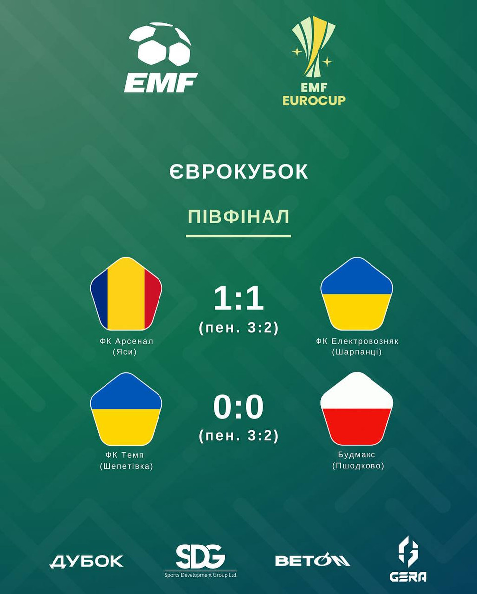 В полуфинале Темп в серии пенальти одолел польский Будмакс (3:2) после нулевой ничьей в основное время, а Электровозняк уступил в "лотерее" румынскому Арсеналу (1:1, пенальти 2:3).