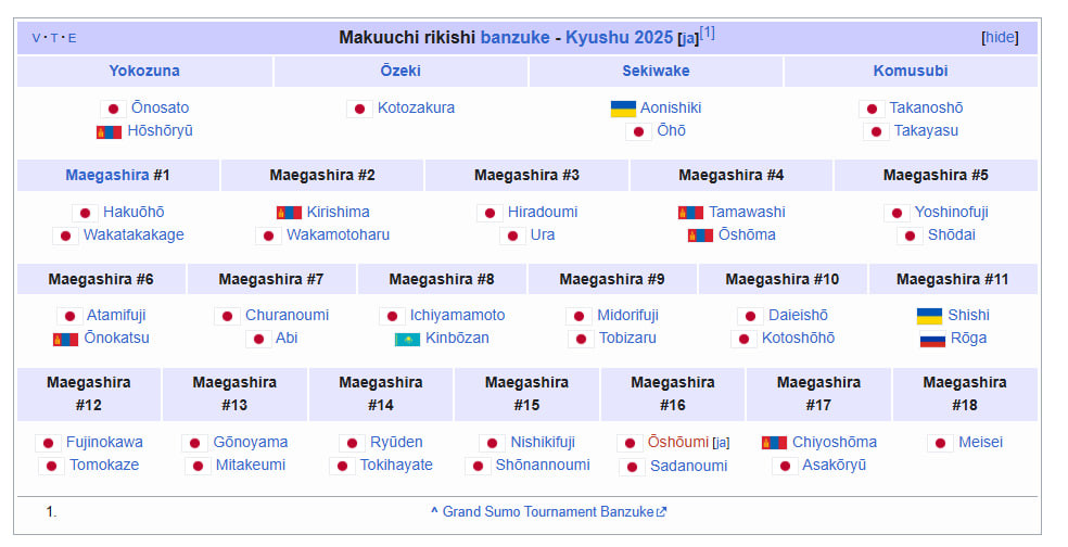 Банзуке (рейтинг – прим.) сумоистов перед турниром в Фукуоке. Следующий гранд-турнир пройдет в январе следующего года.