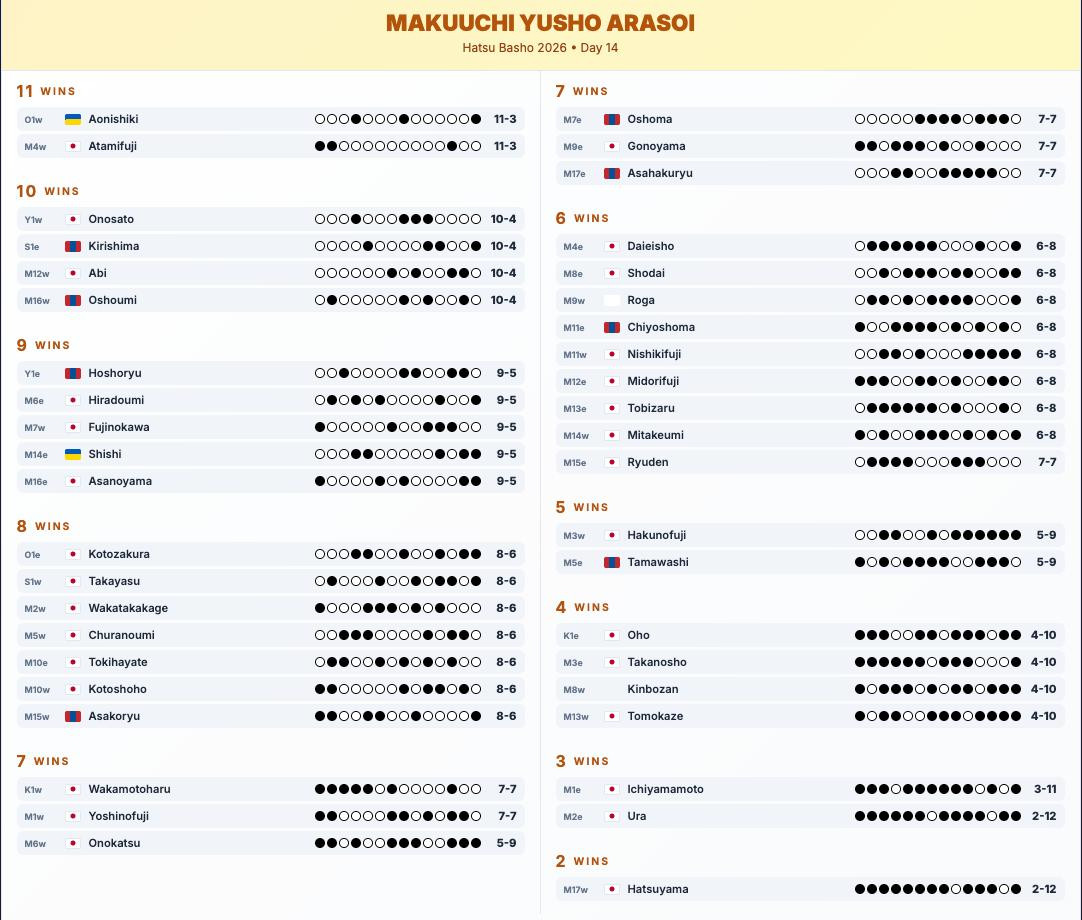 Сегодня, 24 января, в Токио на арене "Ryogoku Kokugikan Sumo Arena" завершился четырнадцатый день турнира Hatsu Basho.