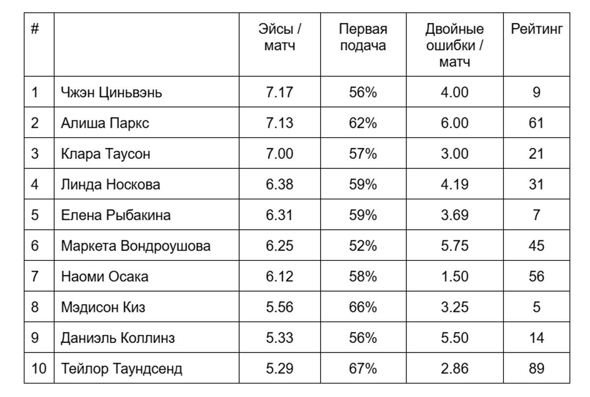 В женском теннисе болельщики привыкли видеть меньше эйсов, но их также хватает. Скорость подачи у женщин в целом меньше на 15-20%, но сильнейшие представительницы этого вида спорта могут подавать со скоростью более 190 км/ч. Олимпийская чемпионка Парижа-2024 Чжэн Циньвэнь за последние 12 месяцев достигла показателя 31.2% подач, которые соперницы не смогли вернуть в игру. Это существенная помощь в защите своих геймов, что непременно дает положительный результат на длинной дистанции сезона. Неудивительно, что в этом году китаянка является одной из лидеров по количеству эйсов в WTA-туре - 7.17 за матч, а также по частоте подач навылет (9.8%). Также среди лучших по среднему количеству эйсов оказались американка Алиша Паркс (7.13) и представительница Казахстана Елена Рыбакина (6.31). Рост двух последних 1.85 м и 1.84 м соответственно, они одни из самых высоких в первой сотне мирового рейтинга. В игре американки не хватает стабильности, она имеет большое количество двойных ошибок (6 за игру), что мешает Паркс сделать качественный прыжок в мировой классификации (лучшее достижение - 40 место). У Чжэн и Рыбакиной среднее количество двойных значительно ниже - 4,0 и 3,69 за игру.