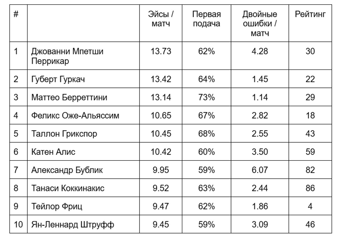 Сейчас уже прошли 10 недель сезона-2025 и можно подвести промежуточные итоги. Молодая надежда французского тенниса Джованни Мпетши Перрикар продолжил достижение прошлого сезона, выигрывая примерно каждое пятое очко на своей подаче эйсами (21.7% в 2024-м и 19.1% в 2025-м). Один из самых высоких теннисистов ATP-тура (2.03 м) хоть и пропустил почти весь февраль из-за болезни после выступлений за сборную на Кубке Дэвиса, уже вернулся на корт и выполнил 10 подач навылет в первом сете матча против венгра Фабиана Марожана в матче второго круга на хардовом Мастерсе в Индиан-Уэллсе.
