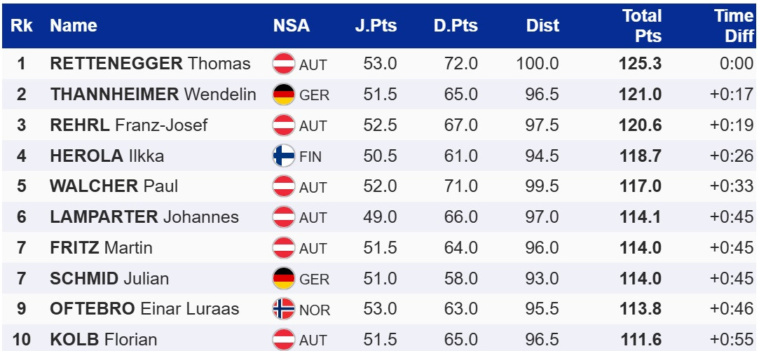 Реттенеггер на 4,3 балла опередил немца Венделина Таннхаймера, топ-3 замкнул еще один представитель Австрии, Франц-Йозер Рерль. Для Реттенеггера это первый в карьере подиум на Кубке мира, для Реттенеггера – первый подиум.