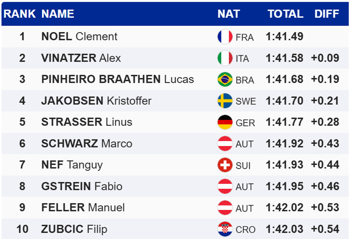 Несмотря на ошибку, Ноэль во второй попытке прорвался с четвертого места к победе. Итальянец Алекс Винтцер с 11-й позиции на вторую. Это его личный рекорд на Кубке мира и суммарно только третий подиум. Топ-3 замкнул Лукас Бротен, для которого это третий подиум после возвращения в спорт под бразильским флагом.