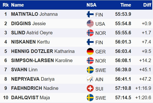 В финишном спринте Матинтало опередила лидера общего зачета Кубка мира, звездную американку Джессику Диггинс. Компанию на подиуме им составила норвежская лыжница Астрид Слинд, которая атаковала вместе с Диггинс в начале гонки. Эта атака была нейтрализована еще до середины гонки.