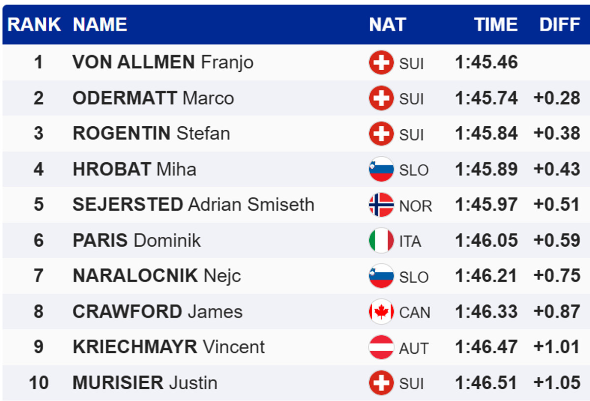 Фон Алльмен на 0,28 секунды опередил лидера общего зачета Кубка мира, швейцарца Марко Одерматта. Топ-3 замкнул еще один представитель Швейцарии, Стефан Рогентен.