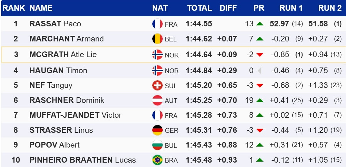 Расса прорвался с 14 места после первой попытки. Француз на 0,07 секунды опередил бельгийца Армана Маршана, для которого это первый подиум на Кубке мира. У Расса до сегодняшнего дня подиумов на Кубке мира также не было. Топ-3 замкнул лидер после первой попытки, норвежец Атле Ли Макграт.