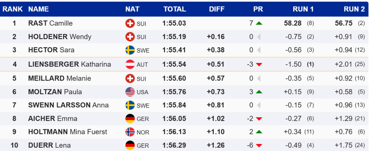 Раст прорвалась с восьмого места после первой попытки и в итоге на 0,16 секунды опередила свою партнершу по команде Венди Холденер. Компанию на подиуме двум швейцаркам составила шведка Сара Хектор.